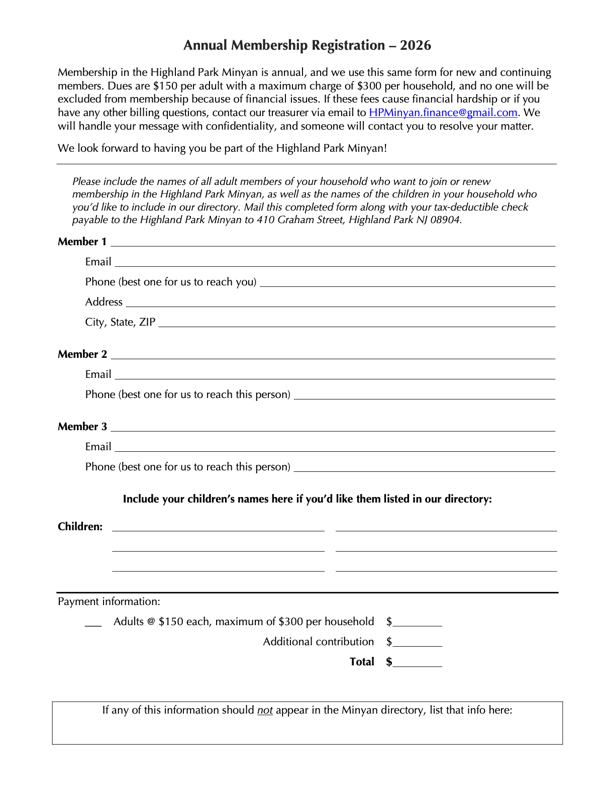 Membership in the Highland Park Minyan is annual and we use this same form for new members and continuing members.